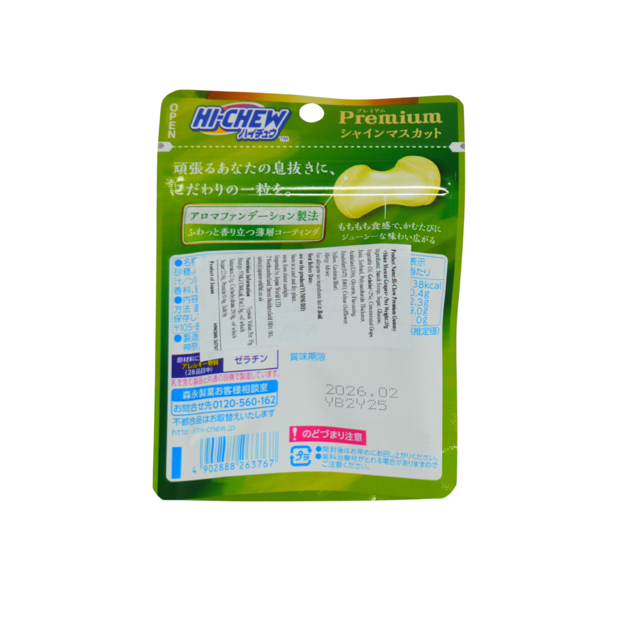 噛むたびに広がる爽やかなマスカットの香りと風味、そして特製の柔らかく歯ごたえのある食感が特徴のプレミアムハイチュウです。
