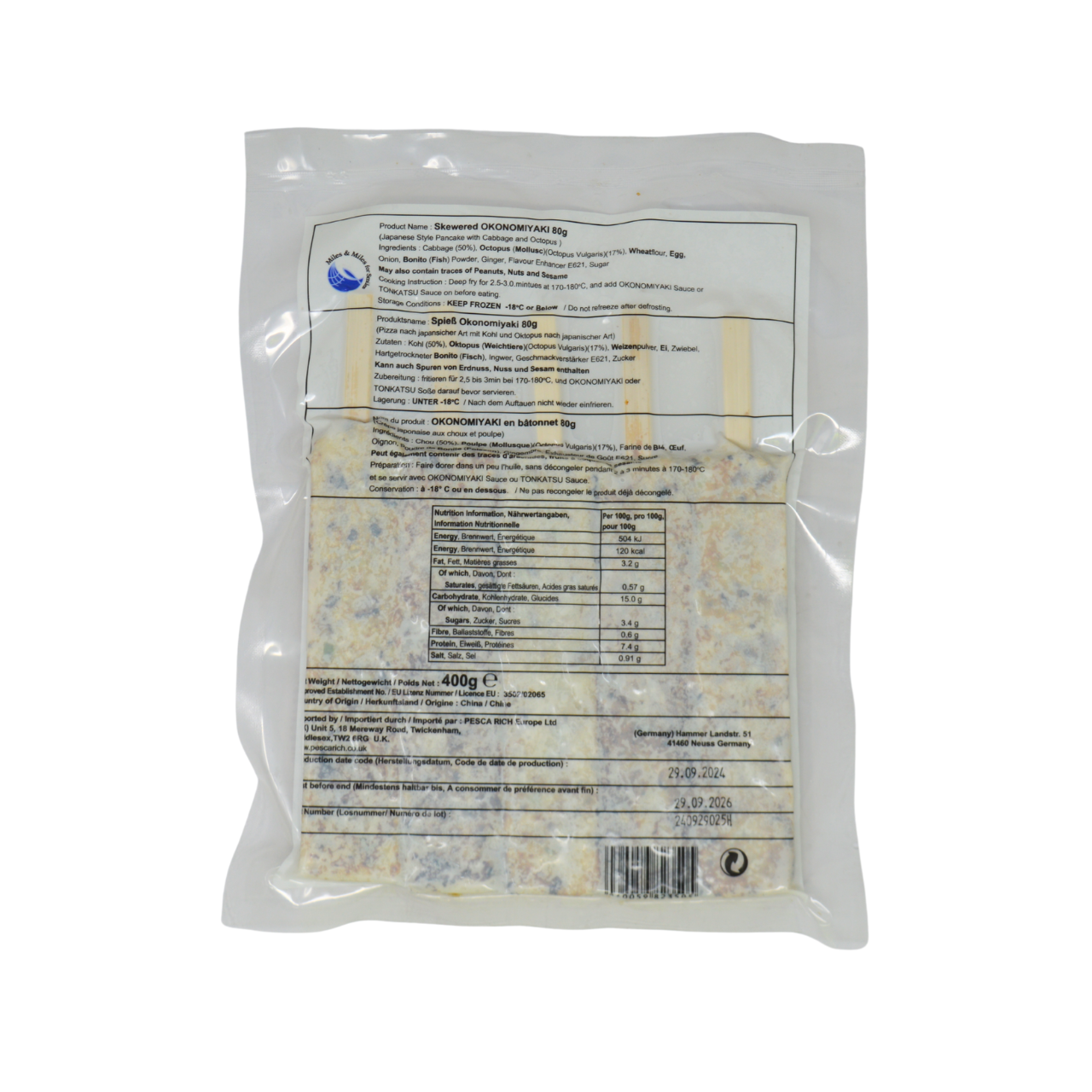 キャベツ(50%)、タコ(軟体動物)(Octopus Vulgaris)(17%)、 小麦 小麦粉、 卵、 タマネギ、 カツオ (魚)パウダー、生姜、調味料E621、砂糖。微量の ピーナッツ、 ナッツ そして ゴマ