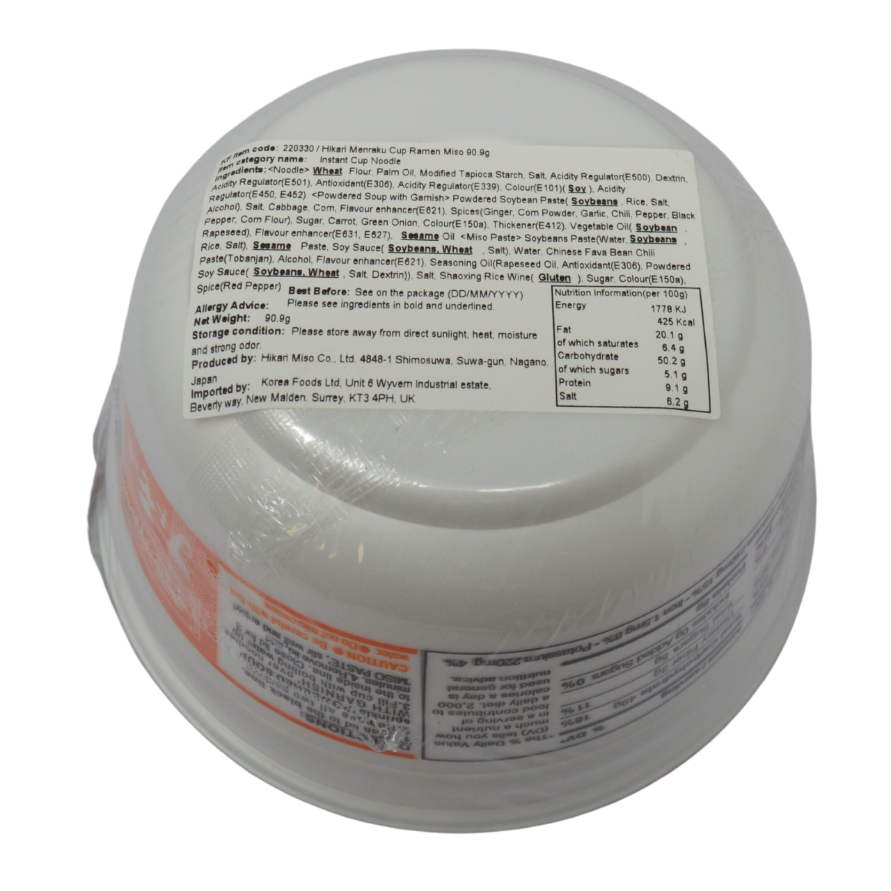 <Noodle> Wheat Flour, Palm Oil, Modified Tapioca Starch, Salt, Acidity Regulator(E500), Dextrin, Acidity Regulator(E501), Antioxidant(E306), Acidity Regulator(E339), Colour(E 101)(Soy ), Acidity Regulator(E450, E452) <Powdered Soup with Garnish> Powdered Soybean Paste( Soybeans, Rice, Salt, Alcohol), Salt, Cabbage, Com, Flavour enhancer(E621), Spices(Ginger, Com Powder, Garlic, Chili, Pepper, Black Pepper, Corn Flour), Sugar, Carrot, Green Onion, Colour(E150a). Thickener(E412), Vegetable Oil (Soybean , Rapeseed), Flavour enhancer(E631, E627), Sesame Oil <Miso Paste> Soybeans Paste(Water, Soybeans , Rice, Salt), Sesame Paste, Soy Sauce( Soybeans, Wheat, Salt), Water, Chinese Fava Bean Chili Paste(Tobanjan), Alcohol, Flavour enhancer(E621), Seasoning Oil(Rapeseed Oil, Antioxidant(E306), Powdered Soy Sauce( Soybeans, Wheat, Salt, Dextrin)), Salt, Shaoxing Rice Wine( Gluten), Sugar, Colour E 150a),Spice(Red Pepper)