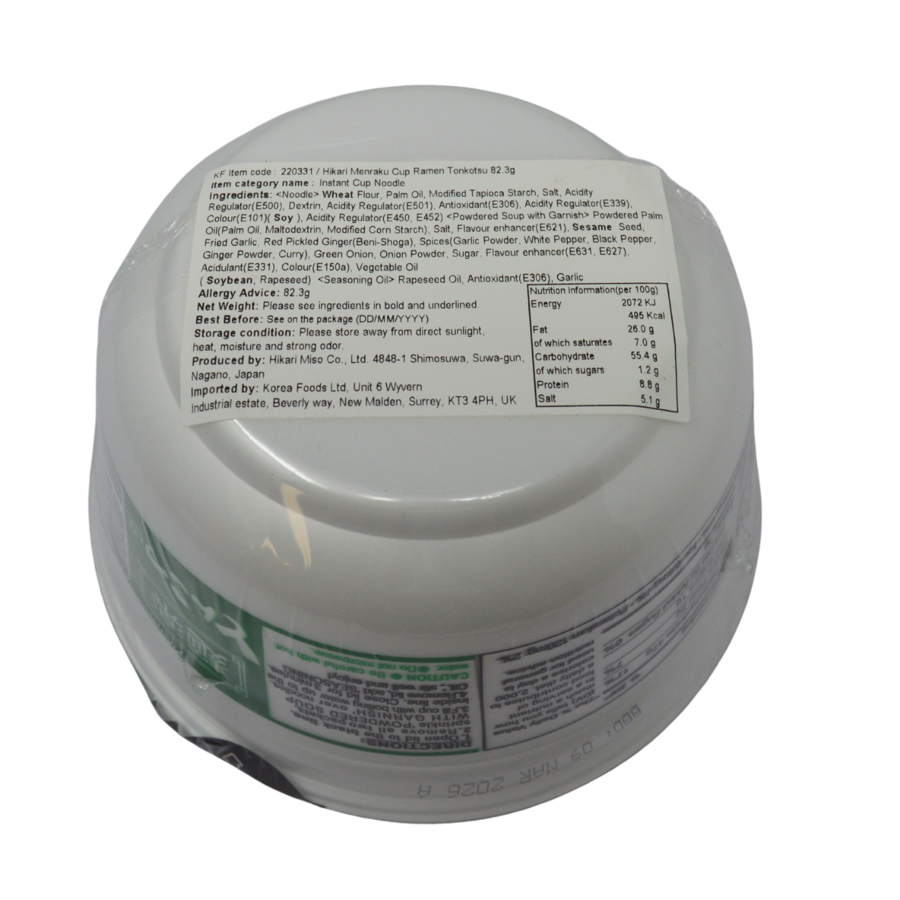 <Noodle> Wheat Flour, Palm Oil, Modified Tapioca Starch, Salt, Acidity Regulator(E500), Dextrin, Acidity Regulator(E501), Antioxidant(E306), Acidity Regulator(E339), Colour(E 101)(Soy ), Acidity Regulator(E450, E452) <Powdered Soup with Garnish> Powdered Soybean Paste(Water, Soybeans, Rice, Salt), Powdered Palm Oil(Palm Oil, Maltodextrin, Modified Com Starch), Salt, Flavour enhancer(E621), Sesame Seed, Sugar, Spices(Fried Garlic Powder, Red Pepper, Garlic Powder, White Pepper, Ginger Powder), Fried Garlic, Fermented Seasoning( Wheat, Soybeans, Dextrin, Salt), Hydrolyzed Com Protein, Green Onion, Powdered Sesame Oil (Sesame Oil, Cassava, Vitamin E( Soy)), Onion Powder, Paprika Powder, Chinese Cabbage Extract Powder, Colour(E150a), Vegetable Powder(Onion Powder, Modified Starch, Green Onion Powder), Flavour enhancer(E631, E627), Colour(E160c), Chinese Bamboo Shoots Powder «Seasoning Oil> Sesame Chili Oil, Colour(E 160c)( Soy )
