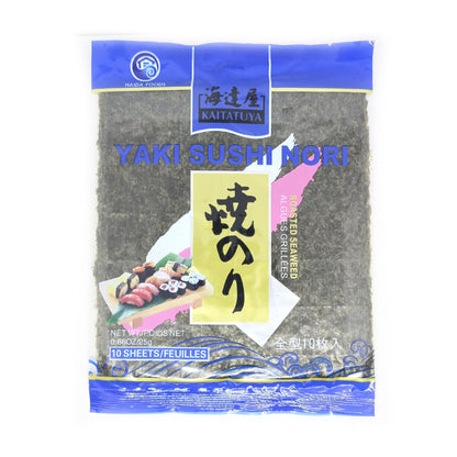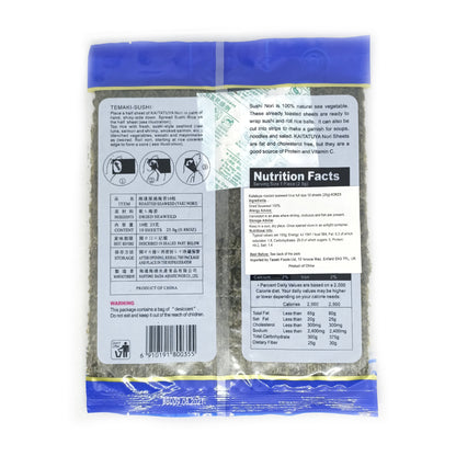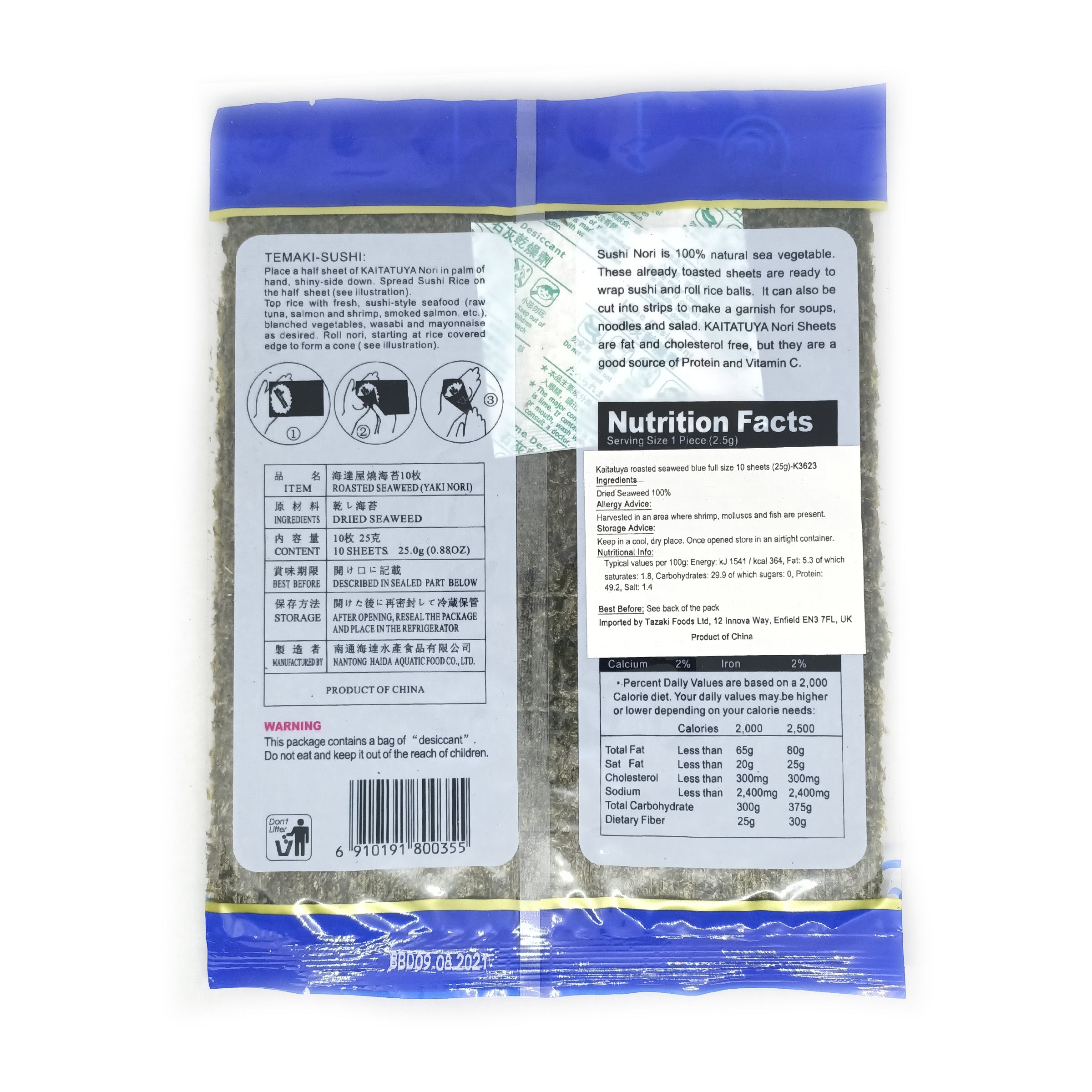 These already toasted nori sheets are ready to wrap sushi and roll rice balls. It can also be cut into strips or shredded to make a garnish for soups, noodles and salad. Kaitatuya nori sheets are free from fat and cholesterol but are a good source of protein and vitamin C.