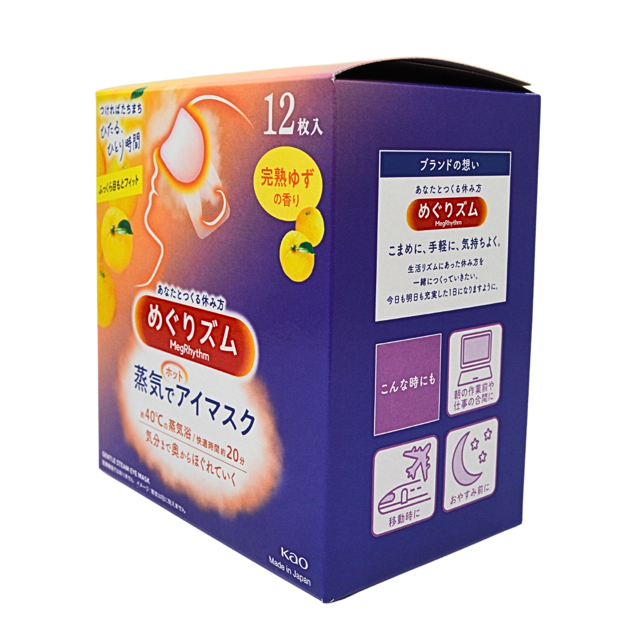 A comforting 40°C steam wraps gently around tired eyes, soothing them from deep within—just like a warm steam bath. Kao’s MegRhythm Steam Eye Mask gently inflates upon contact, fitting snugly with the help of steam for a perfect fit around the eyes. Ideal for use during breaks, travel, before bedtime, or while relaxing at home. Heartwarming scent of fully ripened yuzu citrus.