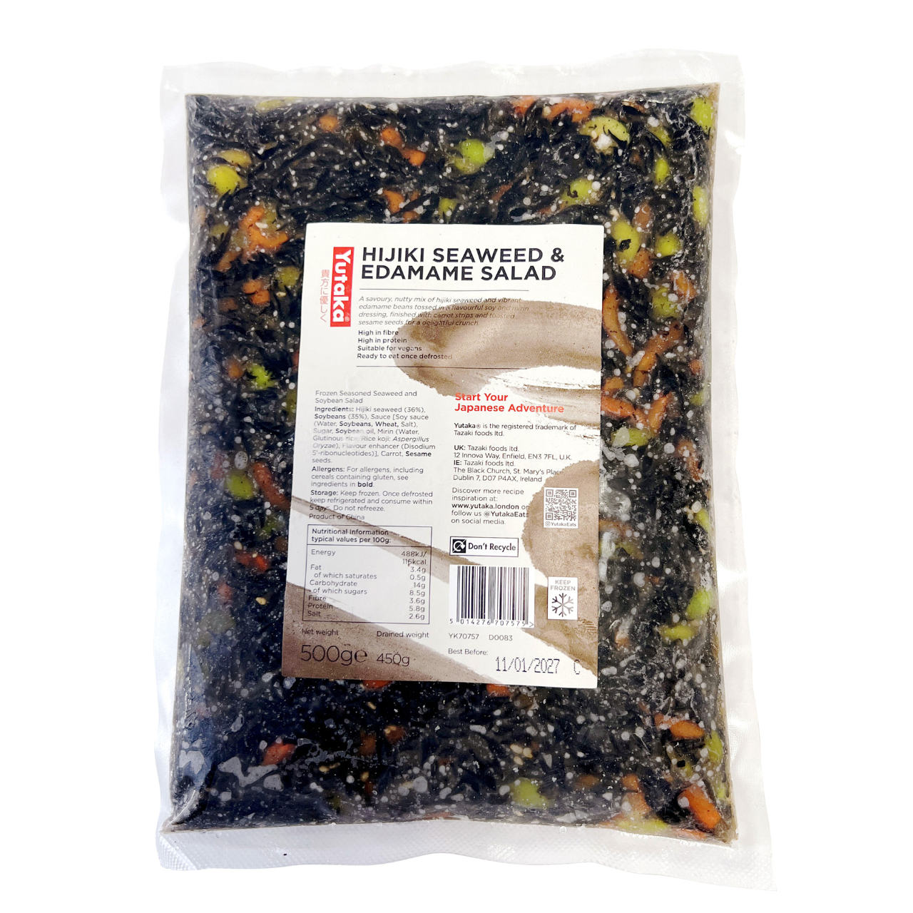 A savoury, nutty mix of hijiki seaweed and vibrant edamame beans tossed in a flavourful soy and mirin dressing, finished with carrot strips and toasted sesame seeds for a delightful crunch.